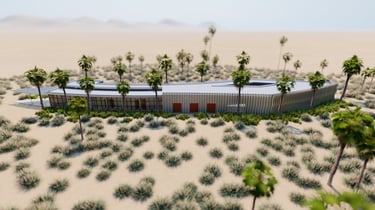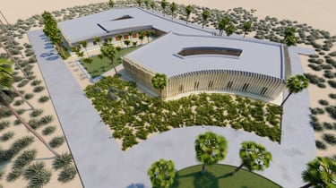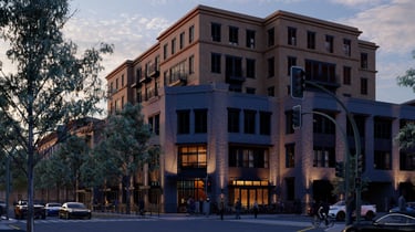 It uses premium materials like glass, metal, and textured concrete to create a striking façade.