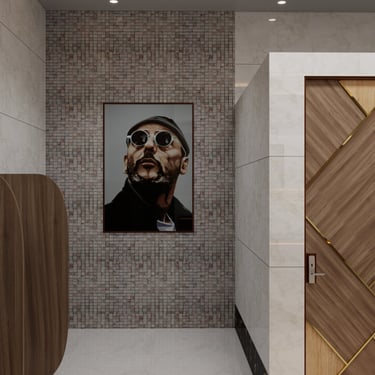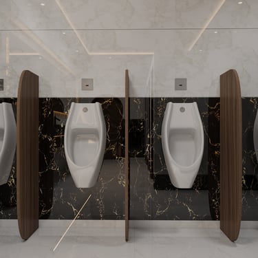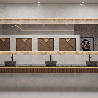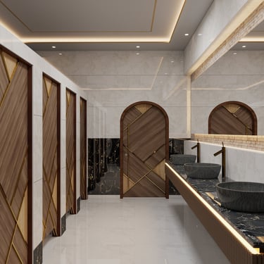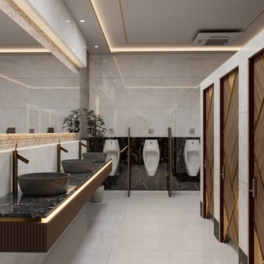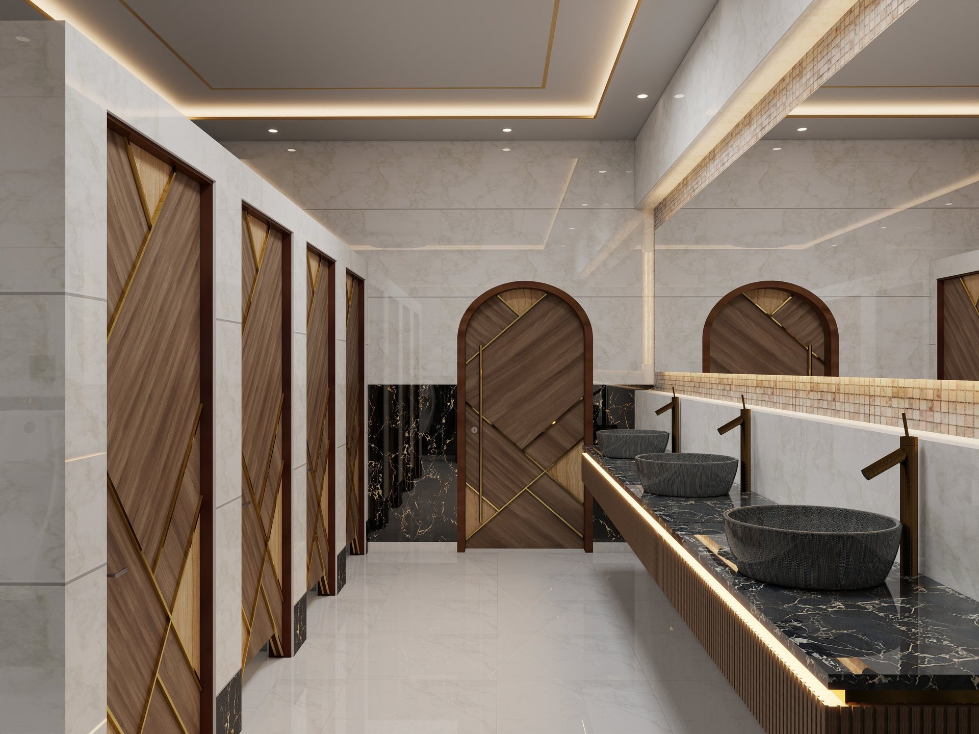 This gents’ toilet features a bold and modern aesthetic with sleek marble finishes, textured mosaic walls, and a striking oversized mirror that enhances the space. The dark stone basins paired with warm accent lighting create a sophisticated, masculine ambiance. Contemporary wood detailing and refined décor add a premium, stylish touch.