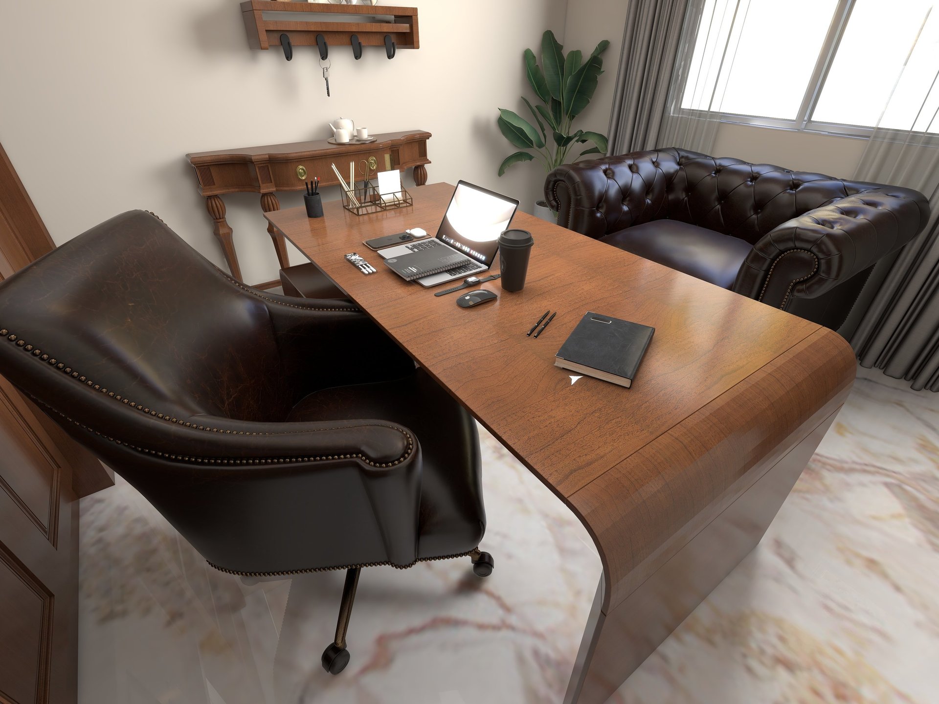 A refined home office for a lawyer, designed with a balance of professionalism and comfort, featuring organized work zones, privacy, and a timeless, authoritative aesthetic.