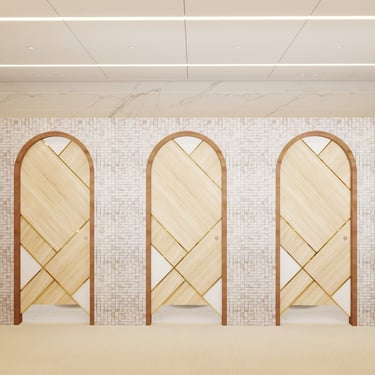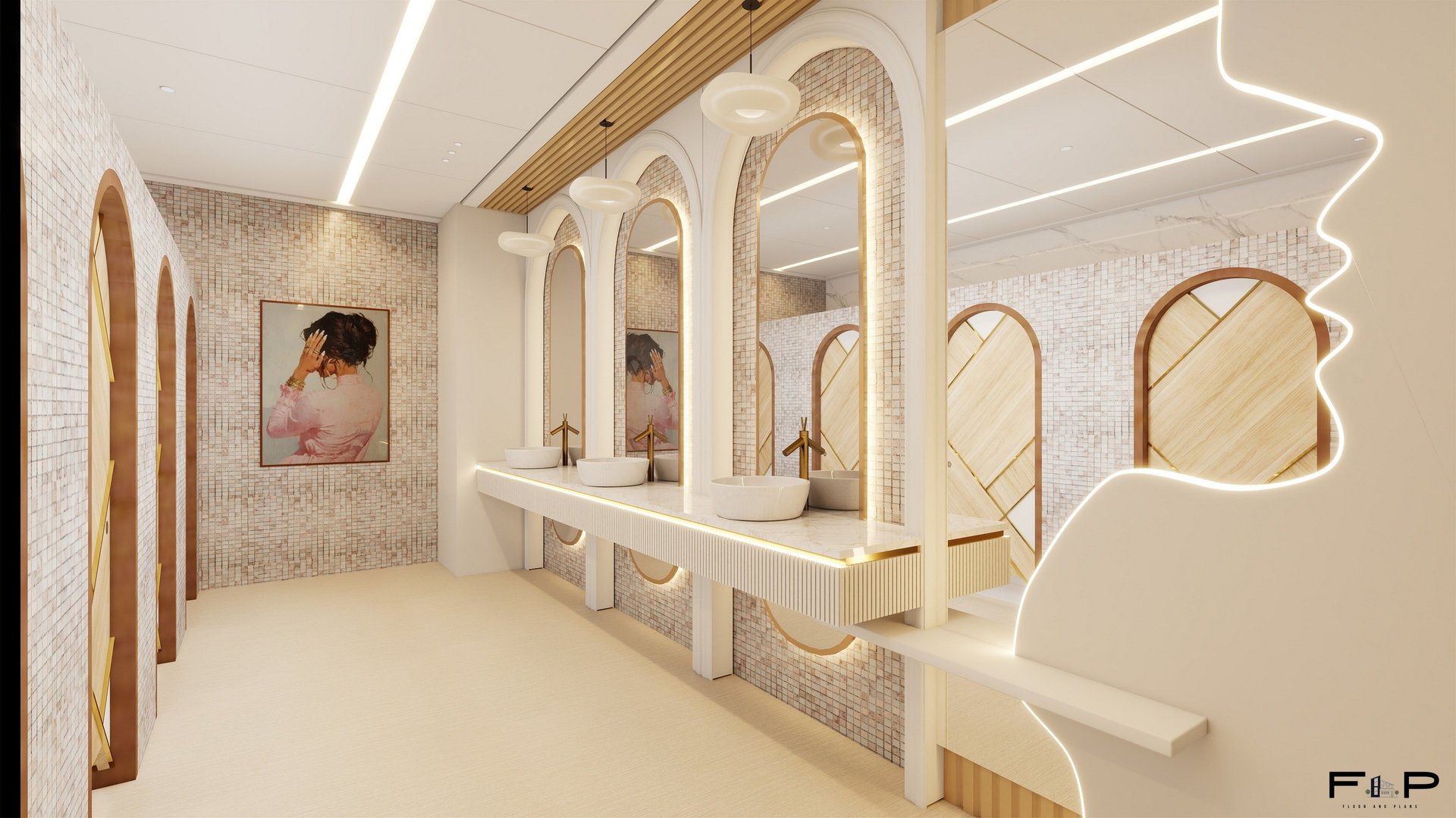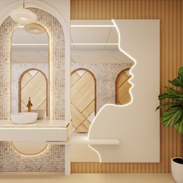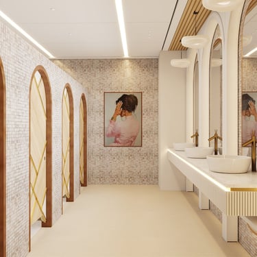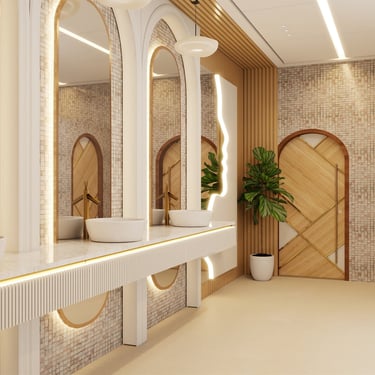 This ladies’ washroom features soft arches, warm backlighting, and elegant mosaic textures that create a luxurious and calming atmosphere. A modern silhouette LED feature wall adds a stylish focal point, complemented by natural wood accents and a clean, contemporary vanity design.