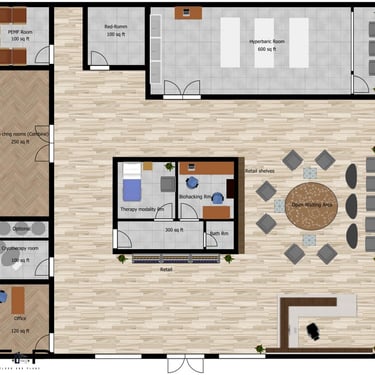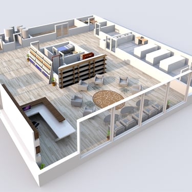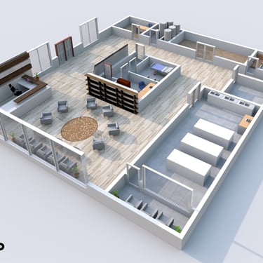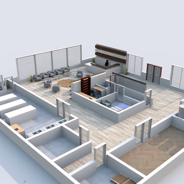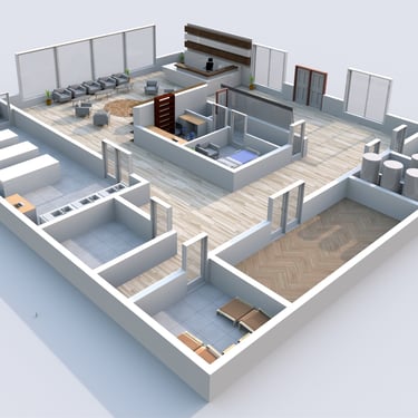 A conceptual 3D longevity lab designed as a futuristic, wellness-driven space integrating advanced health technology, research zones, and a clean, life-optimizing environment.