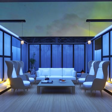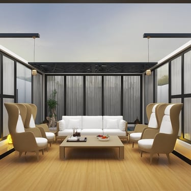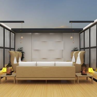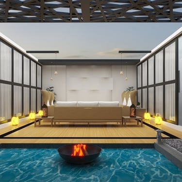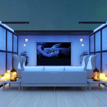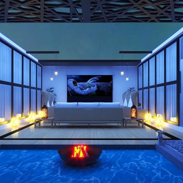 A versatile patio designed for both day and night use, featuring comfortable seating and a private mini theater experience. Thoughtful lighting and layout create a perfect balance of relaxation and entertainment.